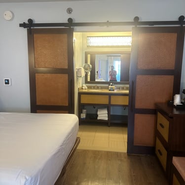 The room we stayed in was very nice, open, and definitely had a fun "Caribbean" vibe which speaks to the name of the resort. For four adults, it worked really well and had plenty of storage and closet spaces. It also had hooks where we could hang purses, hats, etc. The nice surprise about this resort was that in the bathroom, it had a double sink vanity which worked great for 4 adults in the room. The bathroom had a big sliding door that separated the room from the bathroom area and the toilet/shower had a separate door separating that area as well. This was great for getting ready in the morning because someone could be getting ready at the vanity while someone else was showering.