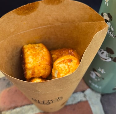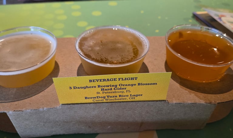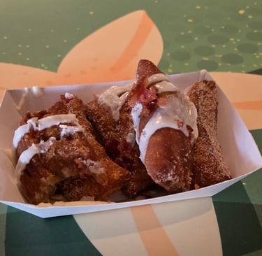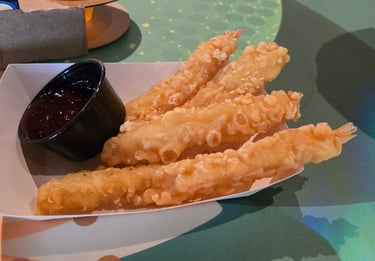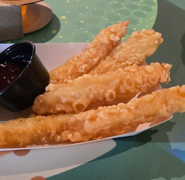 Once we had our rides done for the most part (which we sprinkled in during the day), we did our World Showcase walk around and tried a lot of different things! We first stopped at Imagination Pavilion where we tried the Cider Flight, Fried Cinnamon Bites (Brunchnot – right outside imagination pavilion), and Orange Sesame Shrimp Tempura. Here's my take: