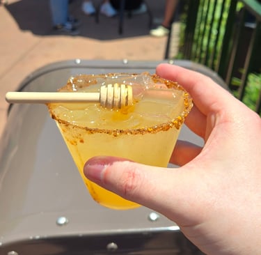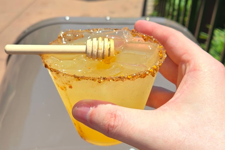 Next, we headed towards the World Showcase where we tried more things around the world. We always have the debate of whether we hit up Mexico or Canada, but we made sure to go to Mexico so that way I could grab the margarita I didn't get a chance to grab last time. There was a drink I specifically wanted to try – and it was the Oxacan Sweetheart: which was Dos Hombres Reposado Mezcal, Lemon Juice, Orange Blossom Honey, and a Pollen Salt Rim garnished with a honeycomb. This drink was delightful and great on the hot day!